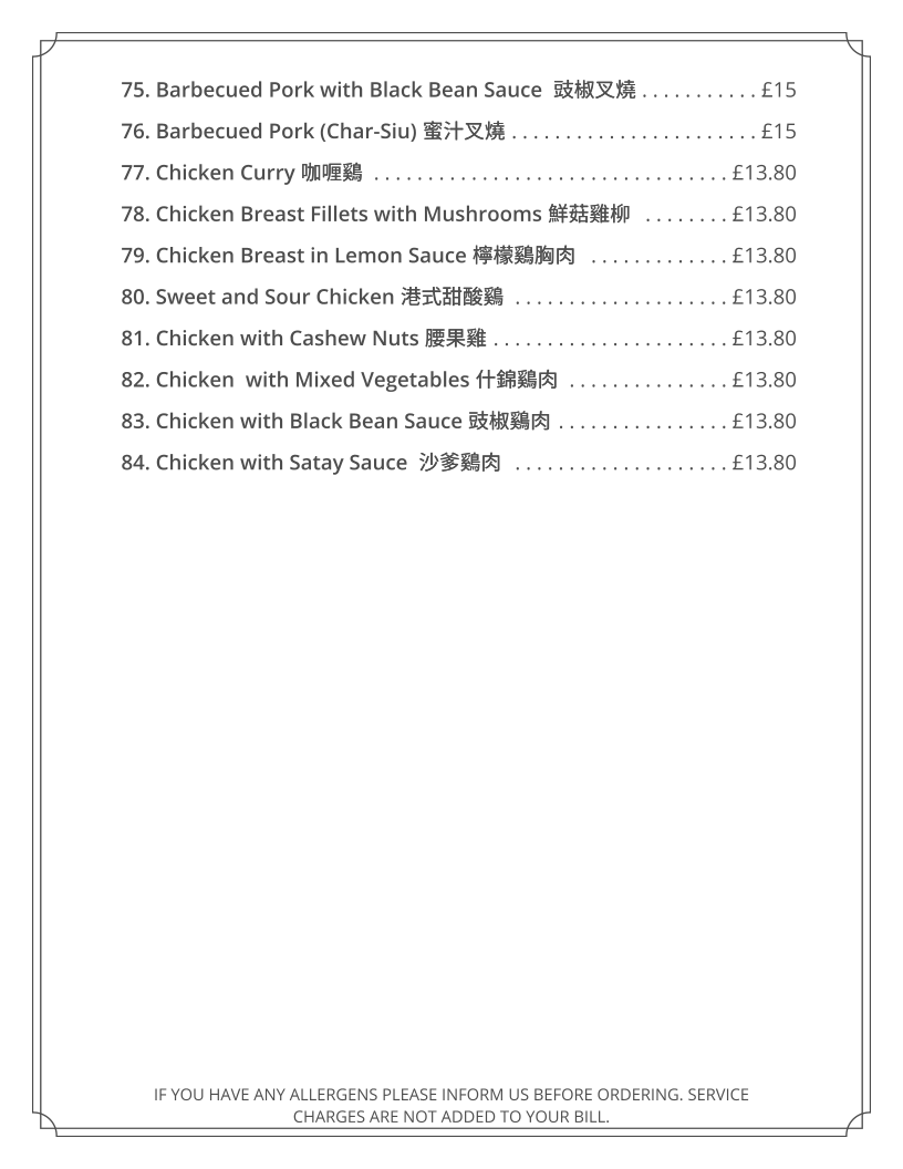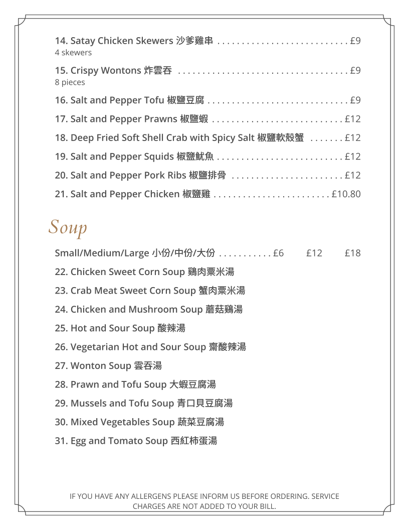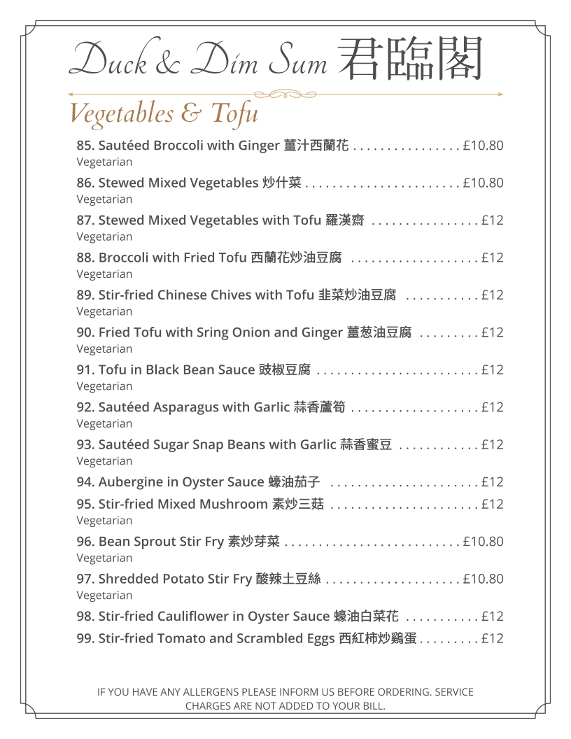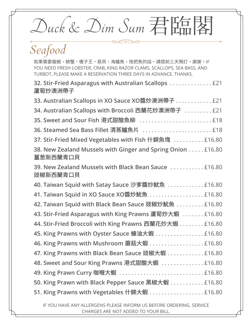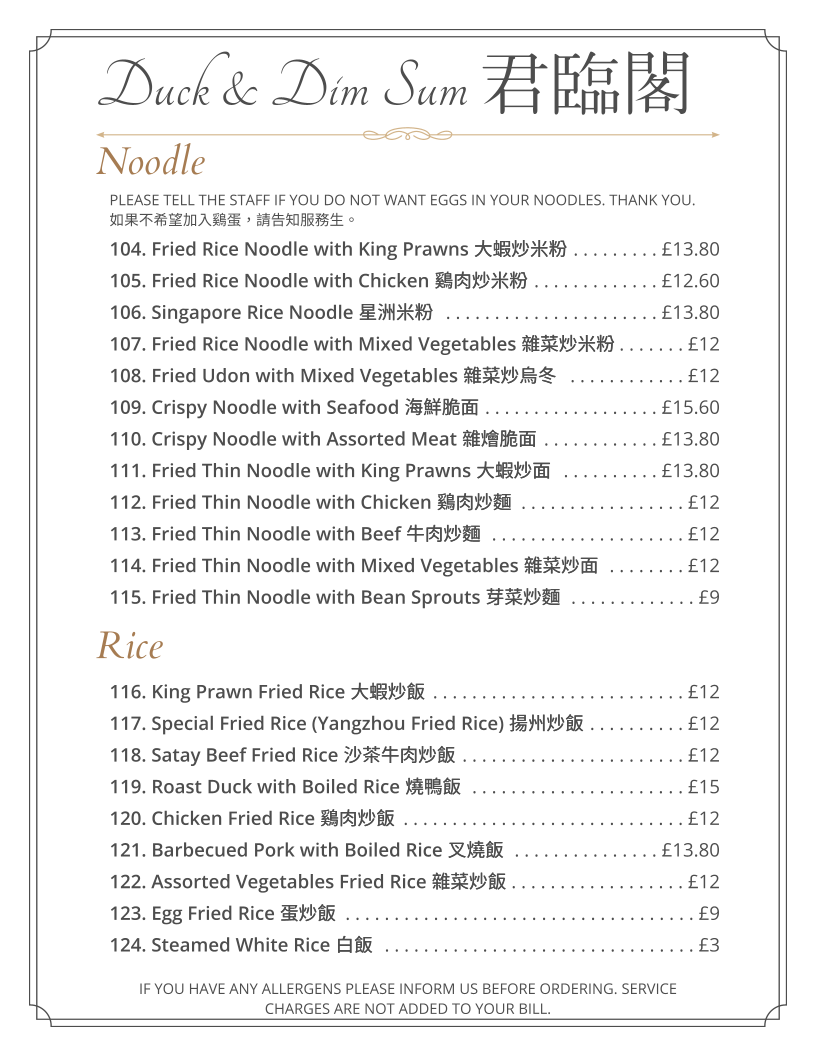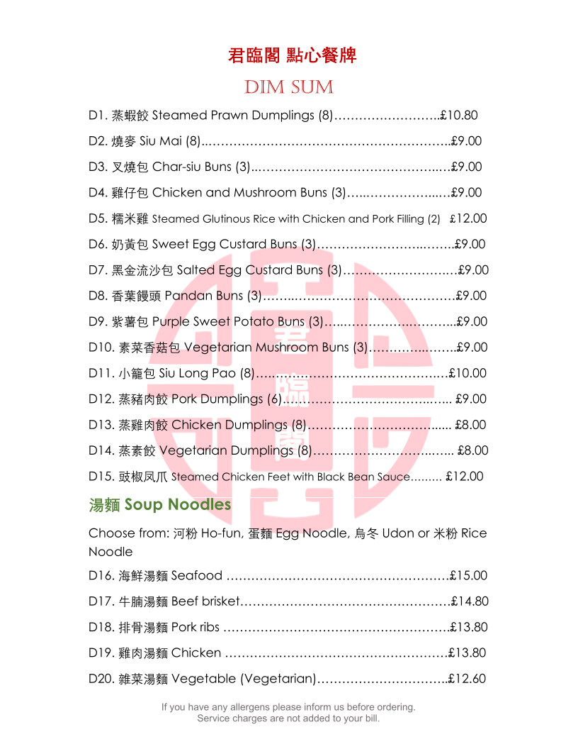 Dim Sum: The dim sum selection includes traditional steamed and fried items like Steamed Prawn Dumplings, Siu Mai, Char Siu Buns, Chicken and Mushroom Buns, as well as a variety of sweet custard buns and vegetarian options. Other offerings include Siu Long Pao (soup dumplings), pork and chicken dumplings, and glutinous rice with chicken and pork filling.