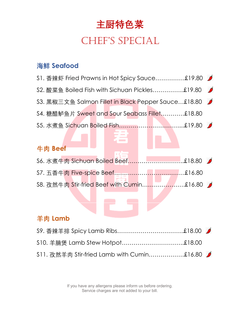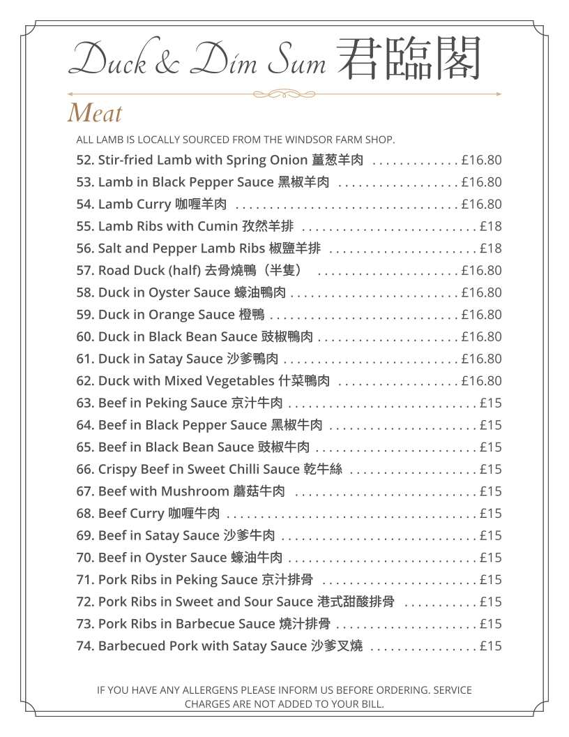 Meat Dishes: This section features a variety of lamb, duck, and beef preparations such as Stir-Fried Lamb with Spring Onion, Lamb in Black Pepper Sauce, Duck in multiple sauces including Oyster, Orange, and Black Bean, as well as Beef in Peking and Black Pepper Sauces. There are also specialty items like Salt and Pepper Lamb Ribs and Sichuan Boiled Beef.
