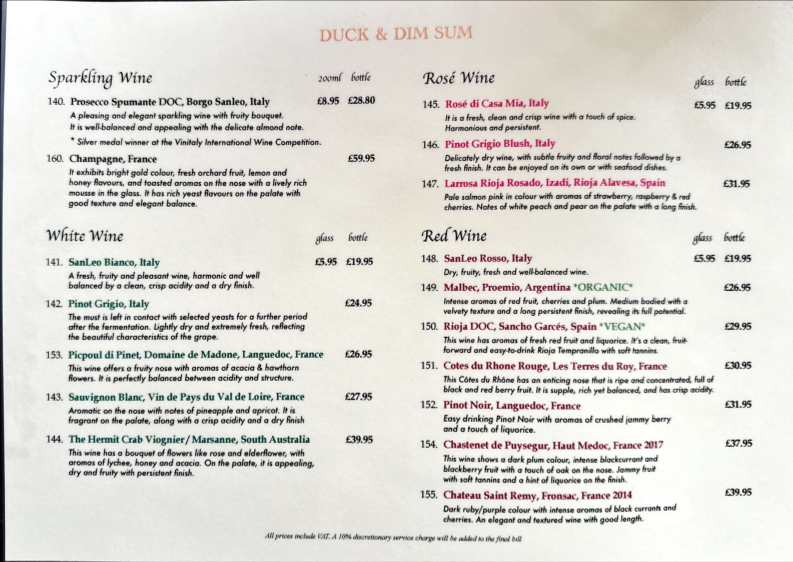 Beverages: The restaurant offers a choice of wines and traditional Chinese teas, which complement the food selections.